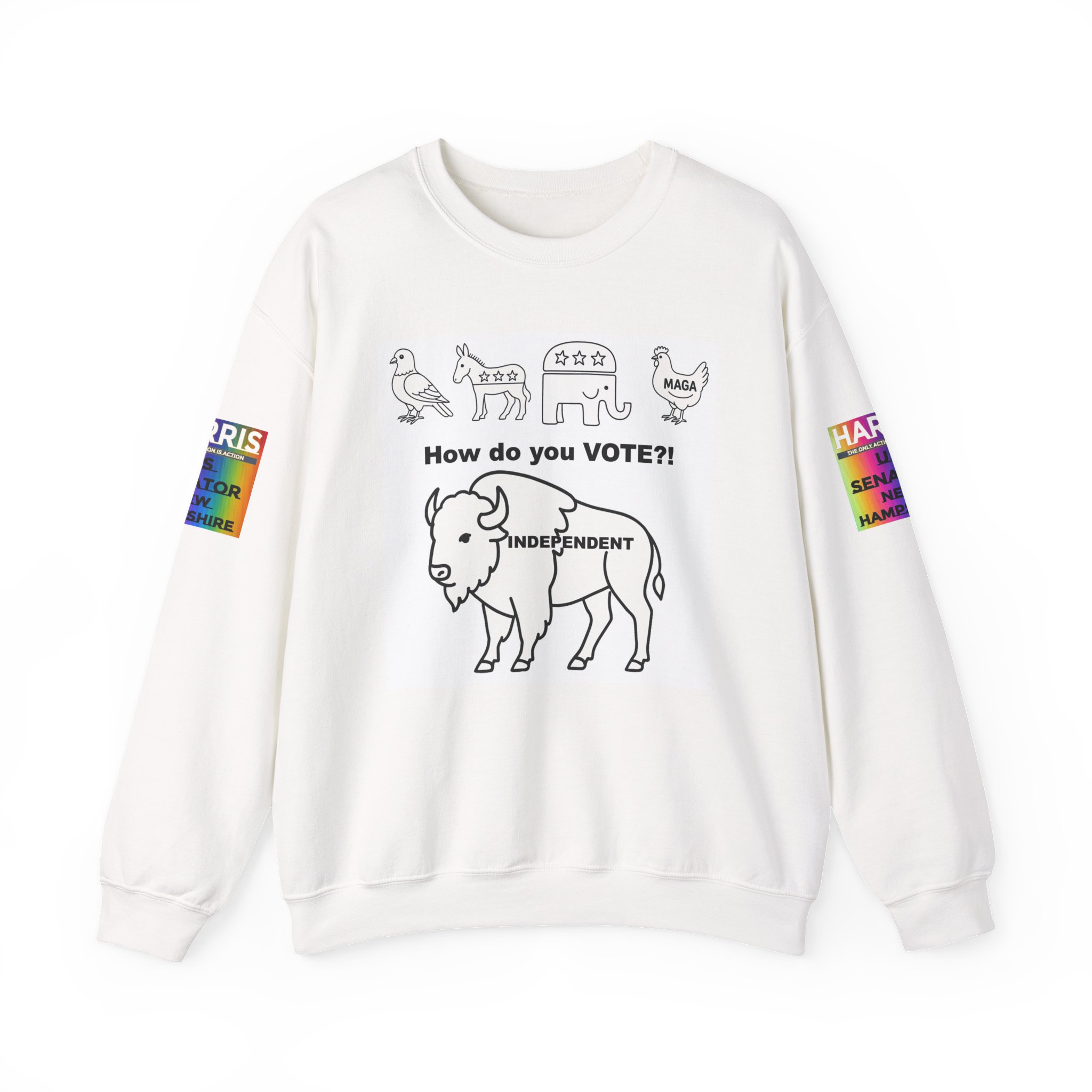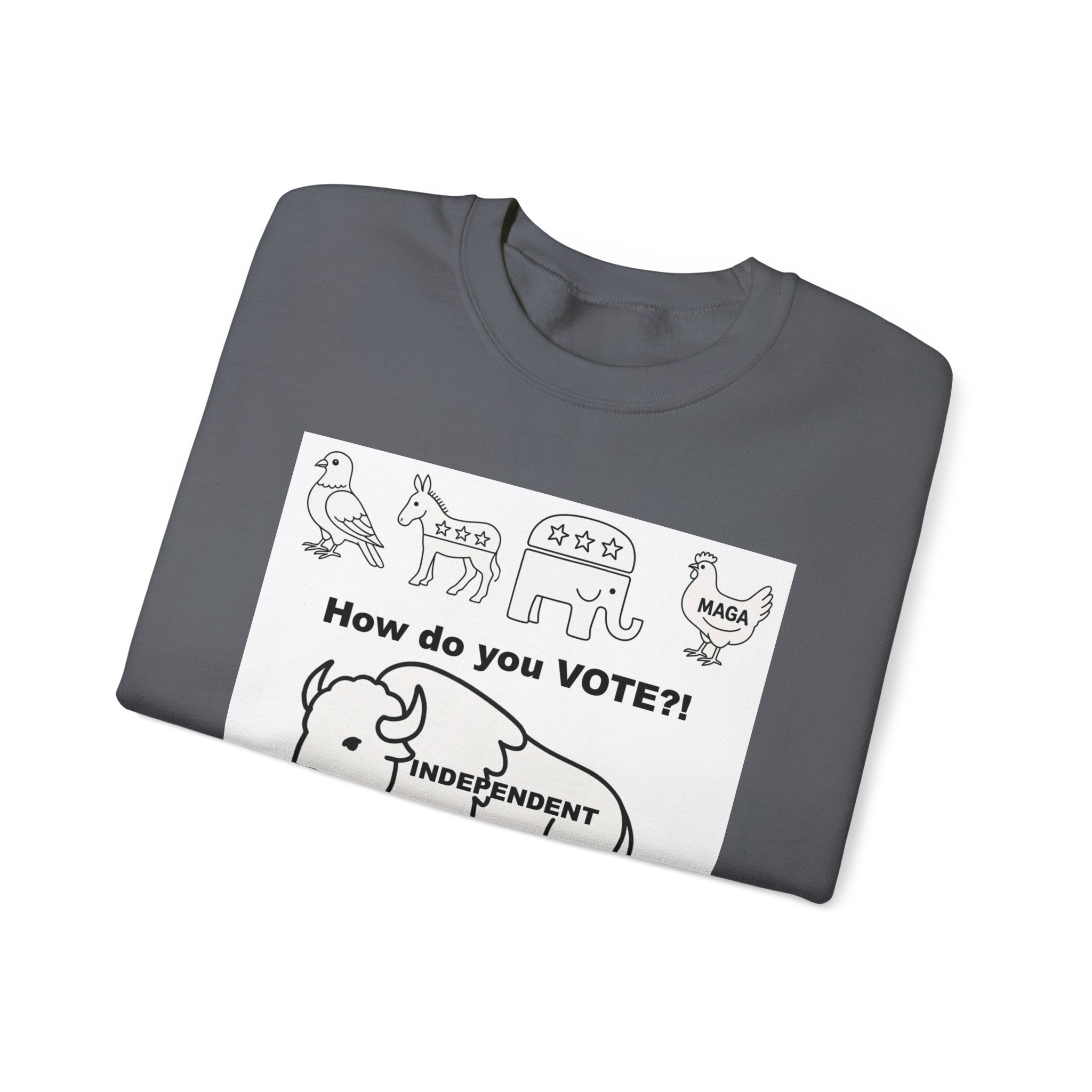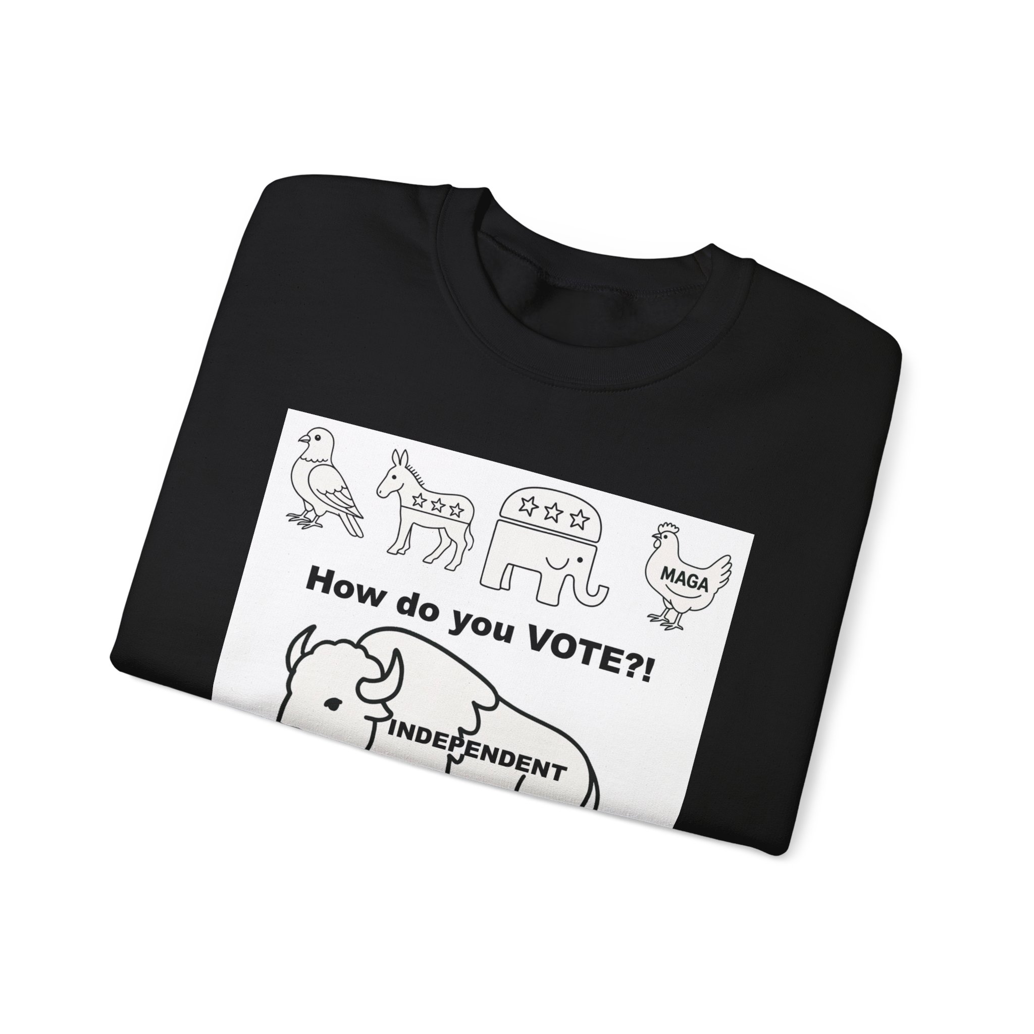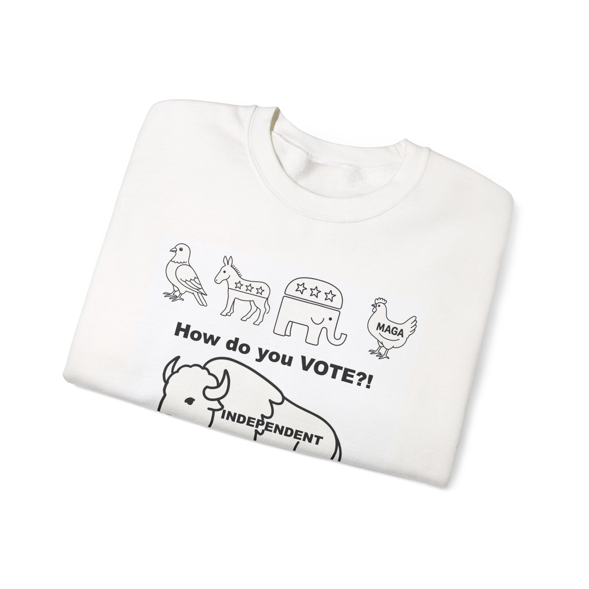 Lightweight warmth with a message. This crewneck pairs clean, durable construction with bold, political artwork—hand-drawn line icons across the chest ask “How do you VOTE?!” above an independent buffalo, “There are a lot of ways people carry themselves through life. One marker I think matters is our voting record. We can be associated with those we’ve voted for, and the pattern of our voting tells a story about who we are.