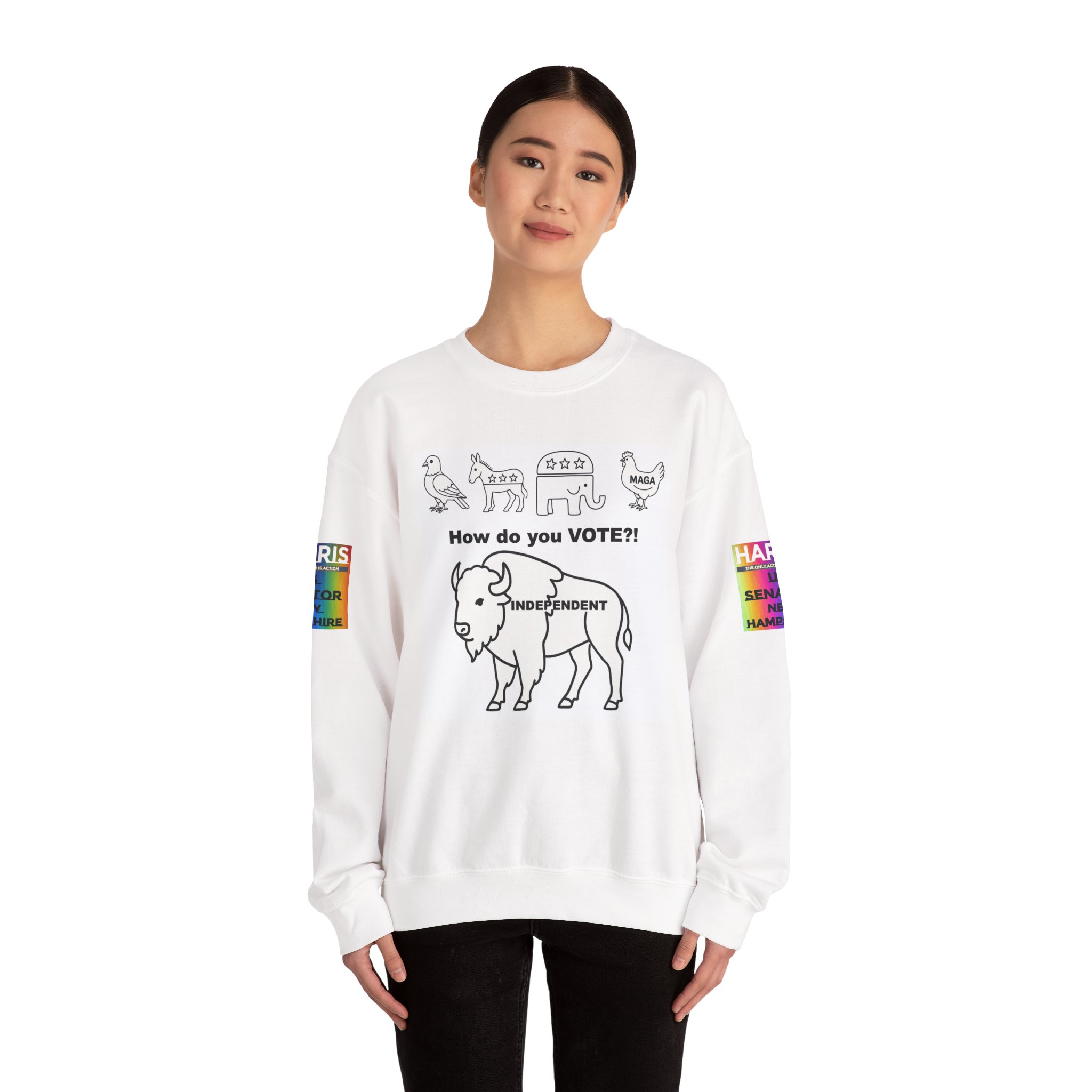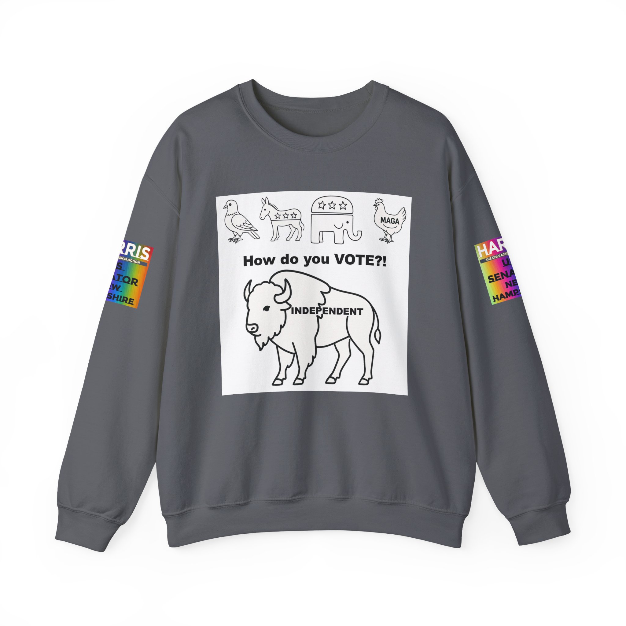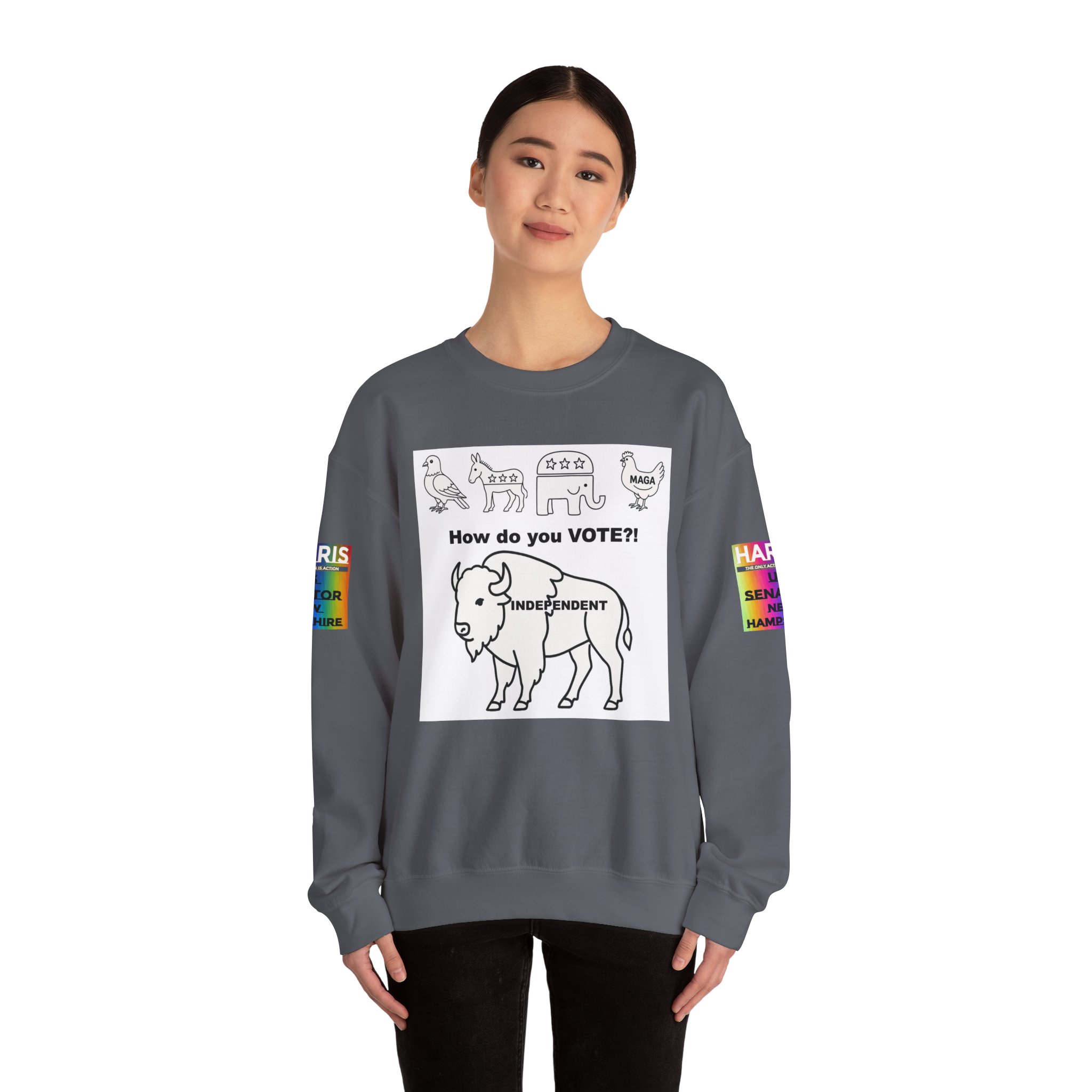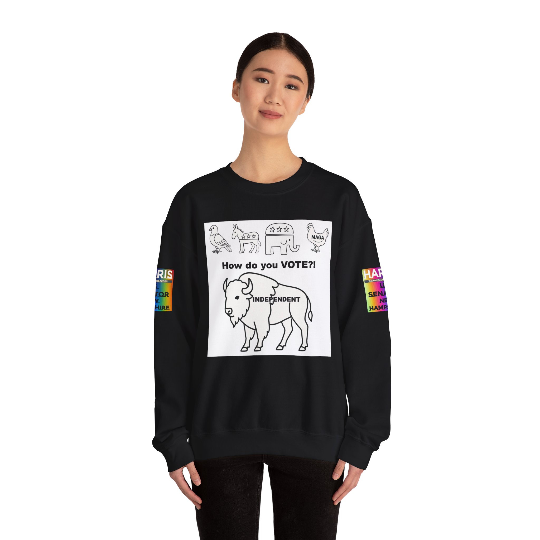 Lightweight warmth with a message. This crewneck pairs clean, durable construction with bold, political artwork—hand-drawn line icons across the chest ask “How do you VOTE?!” above an independent buffalo, “There are a lot of ways people carry themselves through life. One marker I think matters is our voting record. We can be associated with those we’ve voted for, and the pattern of our voting tells a story about who we are.