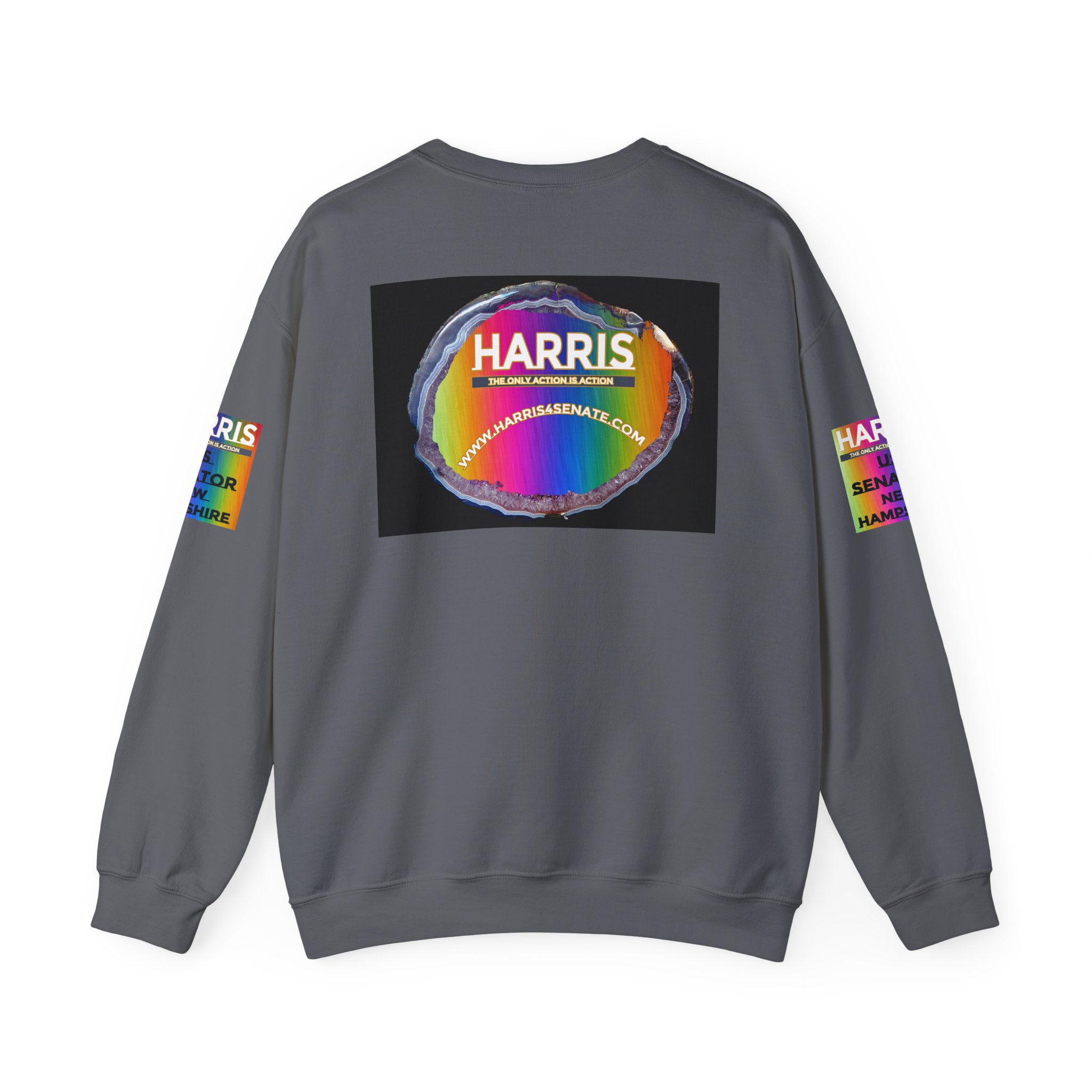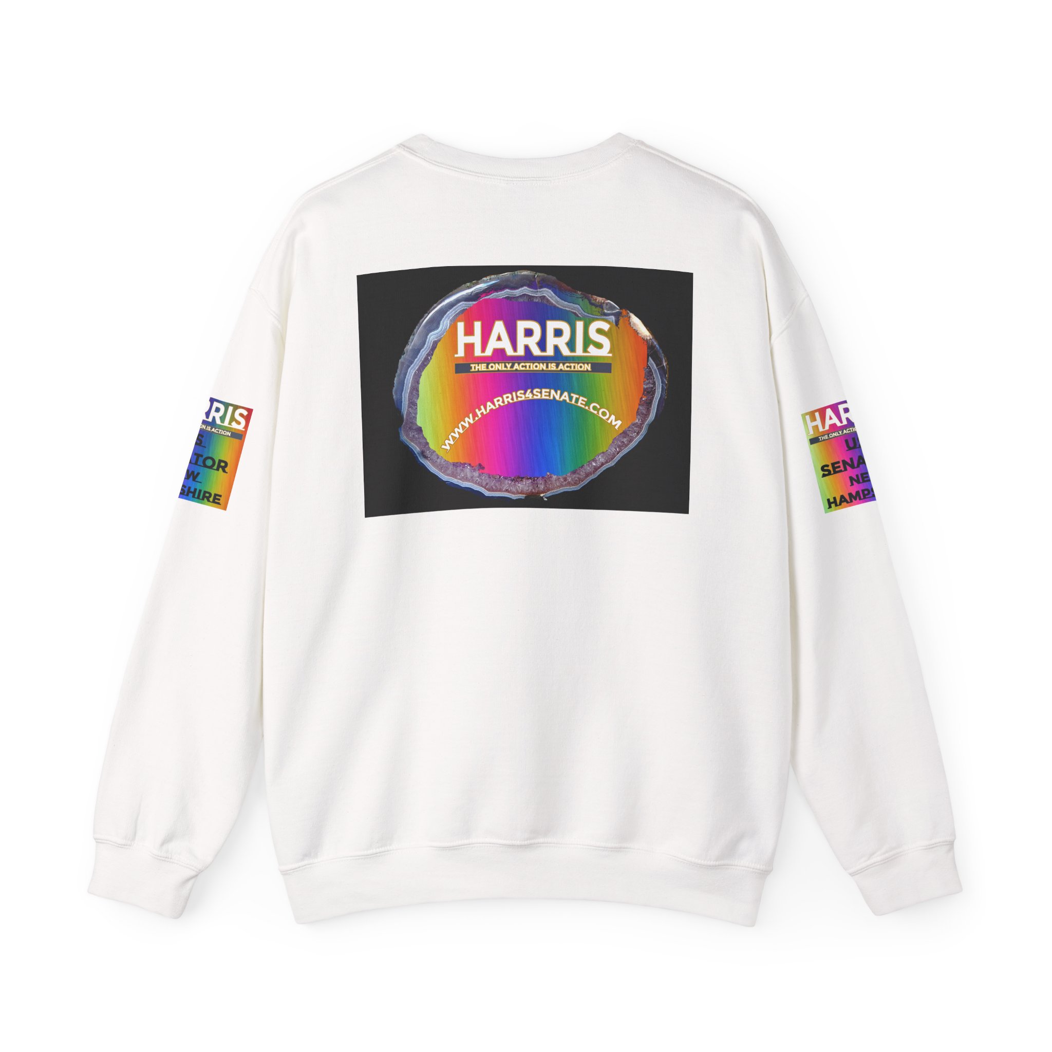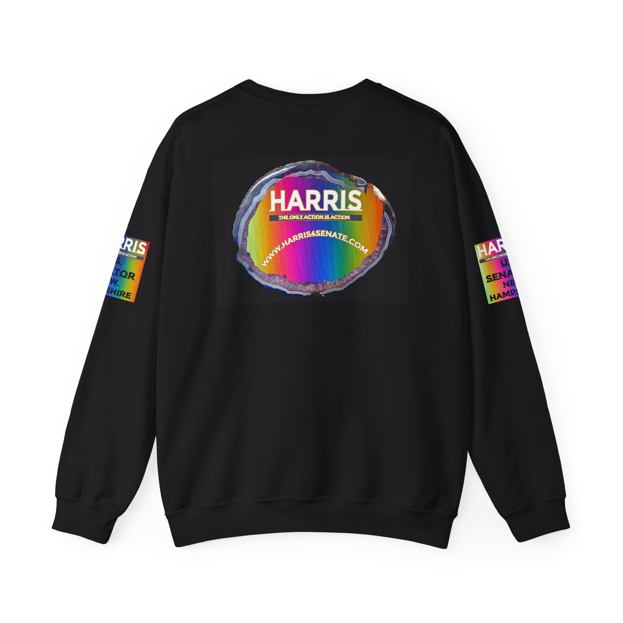 While rainbow Harris patches sit bright on both sleeves and a colorful back panel adds pop. It wears like a trusted favorite: soft, mid-weight fleece that keeps its shape through repeated washes and everyday movement. The quiet, tubular knit body and ribbed collar give a smooth silhouette; reinforced double-needle stitching at stress points means it holds up to long rallies, long commutes, and weekend meetups. Wear it when you want your stance visible without shouting—layer it under a jacket for canvassing, toss it on for post-event hangouts, or keep it handy on cool evenings during election season.